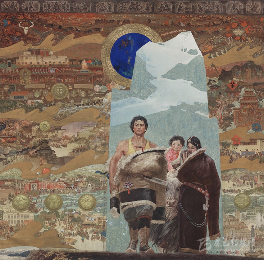 15世紀(jì)以來,唐卡發(fā)展所恒定的兩個(gè)元素:一是平面構(gòu)圖的神佛之境,另一則是吸收大青綠山水精髓。正如DNA鏈的雙螺旋結(jié)構(gòu)一般,使唐卡繪畫在歷史時(shí)空中穿插縈繞,在雪域各地生根開花。到了公元20世紀(jì)初,照片的高度寫實(shí)促使藏地畫家邁出了革新步伐,使得唐卡繪畫逐漸擺脫傳統(tǒng)束縛,開啟了“人”的覺醒。衛(wèi)藏地區(qū)出現(xiàn)了“根敦群培、安多強(qiáng)巴”引入寫實(shí)主義的嘗試,成為當(dāng)今西藏“布面重彩”的先驅(qū)。新中國(guó)成立后,內(nèi)地的美術(shù)創(chuàng)作積極影響了三大藏區(qū)的繪畫發(fā)展,上世紀(jì)80年代,四川康區(qū)“甘孜藏畫”肇起,在《嶺·格薩爾王》人文主義的召喚下,《雪山兒女》《唐東杰布》《新概念唐卡》正從歷史深處一路走來。而近年來,安多藏區(qū)則創(chuàng)新出了“藏族祥巴版畫”,祥巴版畫不僅是從材料技法上對(duì)西藏繪畫的豐富,更是藏地畫家們?cè)谧杂X不自覺的求新、求變;甚至在傳統(tǒng)唐卡領(lǐng)域,民間畫師也都在紛紛嘗試將傳統(tǒng)唐卡和現(xiàn)代審美相結(jié)合。這一切,正是唐卡繪畫從傳統(tǒng)走向現(xiàn)代、由宗教博衍至生活的演變過程,在這個(gè)過程里,藏地畫家不僅在畫面的形式和語(yǔ)言上完成了傳統(tǒng)與當(dāng)代的統(tǒng)一,還將西藏的審美特質(zhì)虹化為作品的精神內(nèi)核。這也是唐卡藝術(shù)第二次“從香巴拉到人間”的過程,成為民族文化發(fā)展的新坐標(biāo)。