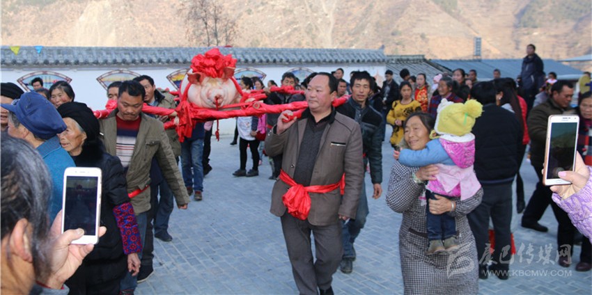 5個(gè)村民將年豬抬到秤上。360斤。村民為年豬準(zhǔn)備大紅花。準(zhǔn)備紙錢(qián)、香蠟。9點(diǎn)整,殺豬匠開(kāi)始了他的工作,在眾人齊心協(xié)力下,光溜溜的年豬被打整干凈。“保佑我們村來(lái)年風(fēng)調(diào)雨順、五谷豐登,村民平安健康。”村中老者敬過(guò)天地后,8個(gè)身強(qiáng)力壯的村民站在年豬旁,豎著拇指齊聲說(shuō),今年家家戶(hù)戶(hù)還要養(yǎng)大肥豬。抬著年豬,村里的中老年人簇?fù)碇?,走在最前面,唱著悅耳的民謠,大意是歌唱幸福生活的,迎著2018年的第一縷陽(yáng)光,村民們喜氣洋洋。到村里來(lái)的游客蜂擁拍照。