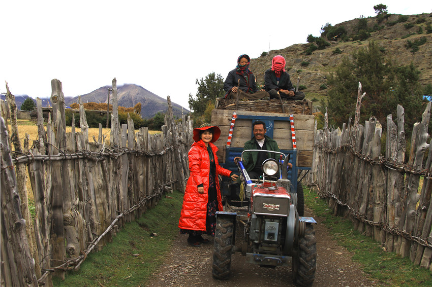 不久雨停下來,山邊露出一縷陽光,天空又是一片碧藍(lán)。我們趕緊繞道藍(lán)湖驛站后面的牧場上,發(fā)現(xiàn)一座臨時搭建的軍用鐵橋可是通向一個小島。走過去,島上景色更美,遠(yuǎn)處雪山冰川倒影晶瑩碧藍(lán)的水中,近處綠樹滿山,草場上牛羊星星點點。島上的小村莊叫阿日村,住著十幾戶人家,青稞剛收獲完畢,男人正忙著把牛羊過冬的草料堆積在高高的木架子上,女人除了撿牛糞外,還要準(zhǔn)備冬天取暖的柴薪。雖然村民大多不能講漢語,但對陌生人通常會含笑致意,一個小伙子還用結(jié)結(jié)巴巴的漢語重復(fù)了兩遍“喝不,青稞酒?”。我們到村民達(dá)娃卓瑪家,她是家里四個孩子中的老大,今年二十二歲,最小的弟弟不到五歲。她上過三年小學(xué),能講一點漢語,臨時充當(dāng)家人的翻譯。父母和奶奶見有客人來,非常熱情,立馬打酥油茶,并端上一盤奶渣,因為不會講漢語,只好不停招呼我們“吃,多吃”。家里的客堂兼經(jīng)堂寬敞干凈,廊柱和供案施以彩繪,供案上擺放兩個活佛的一尺見方的照片,前排供了酥油燈、糌粑和清水。