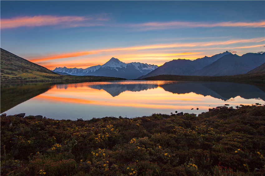 八月的康定本就二十多度,到山上溫度更低一些,加上這里的溪水不比別處的溪流,是雪山融化的水,因此,格外的冰涼。終于到了五色海的邊兒上,整個(gè)海子在眼前呈現(xiàn)。此時(shí)的五色海對于我們來說,可能不單單是個(gè)高山湖泊而已了,在我們抵達(dá)五色海之際太陽露出了笑臉,一切都是剛剛好。中午十分撤離五色?;氐叫∧疚荩赃^午飯開始下山。