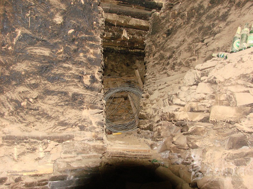 鍋莊房后,有兩道門,其中一間為放置糧食的庫房。而另一間房屋,門檻高于鍋莊房許多,需要跨上兩級(jí)臺(tái)階才能上去。門較矮小,打開房門,一股潮濕的氣味撲鼻而來,眼前一片漆黑,什么也看不見。我打開隨聲攜帶的電筒,借助微弱的光線,勉強(qiáng)能看見房屋內(nèi)的擺設(shè)。房屋的右面角落里,有用木頭搭建起來的籠子,其高約一百三十厘米,寬約一百厘米。在房屋的左邊,有一曲折的甬道,也需要走上兩級(jí)臺(tái)階。牟大哥告訴我,這里是用來關(guān)押犯人的地方。