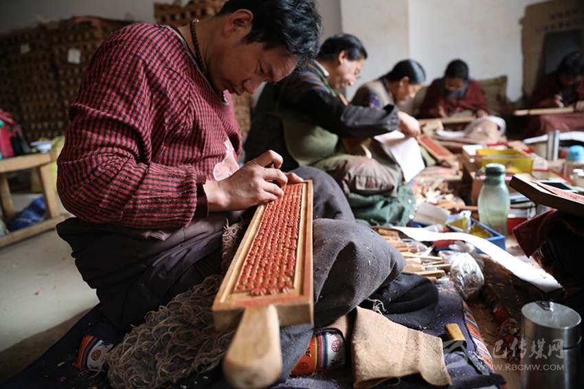 德格籍雕刻工匠格絨介紹說:“這是一項技術(shù)活,所有的文字都需要反刻在紅樺木上,我們大概六到七天能完成一塊經(jīng)板的雕刻。雕刻完成后還要經(jīng)過五次的校對,有錯的進行再次???,最后在雕刻好的經(jīng)板上涂上酥油晾曬,一塊復刻經(jīng)板才算完成?!?/span>