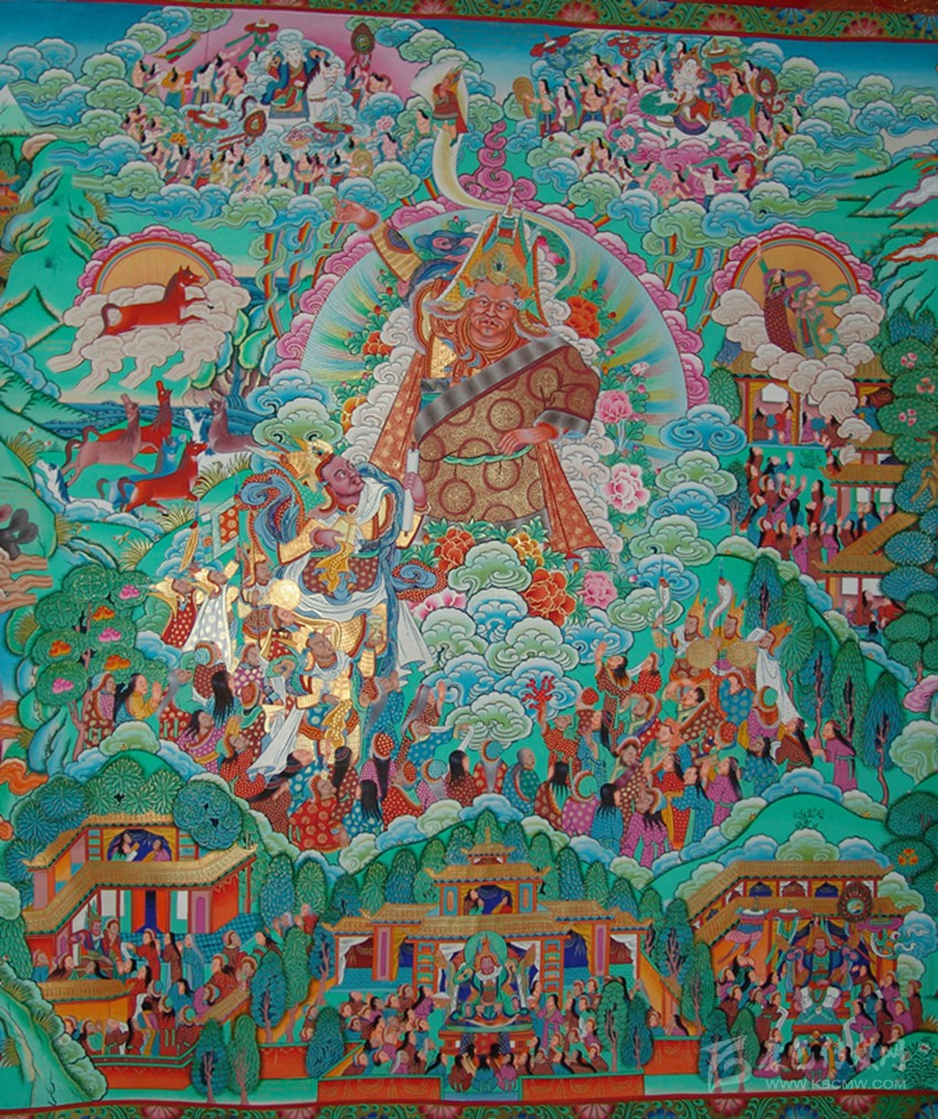 解放前的舊西藏以及其他藏區(qū),基本上處于封建農(nóng)奴制社會和部落社會,實(shí)行政教合一的政治制度。過去藏族基本上是一個全民信教的民族,佛教文化和苯教文化在意識形態(tài)和文化領(lǐng)域占據(jù)統(tǒng)治地位,“德唐”、“協(xié)唐”和“杰唐”也成為唐卡藝術(shù)的主要內(nèi)容。因此,反映宗教觀念、表現(xiàn)宗教題材的唐卡,得到上層統(tǒng)治階級和信教群眾的關(guān)心、重視和扶持,發(fā)展迅速,數(shù)量眾多、藝術(shù)精湛,達(dá)到美侖美奐的程度。為了更深入、更全面地將宗教教義、宗教儀軌、宗教觀念、宗教信仰深入到信教群眾中去,最基本、也是最有效的方式,就是將宗教觀念、宗教信仰藝術(shù)化、形象化,讓藝術(shù)形象凝聚為宗教文化,讓唐卡藝術(shù)生動地、形象地、以通俗易懂的方式講述歷史故事,傳播宗教教義。一些重要的唐卡繪制完畢,還會舉行隆重的開光儀式和祈禱法會,以增強(qiáng)它的神圣性和神秘感。各寺院懸掛的、珍藏的幾乎全是這類唐卡。在過去,豪門貴族、土司頭人,乃至普通人家,也都有懸掛和珍藏唐卡的習(xí)俗。一座寺院收藏幾千幅、乃至上萬幅唐卡,是很平常的。
