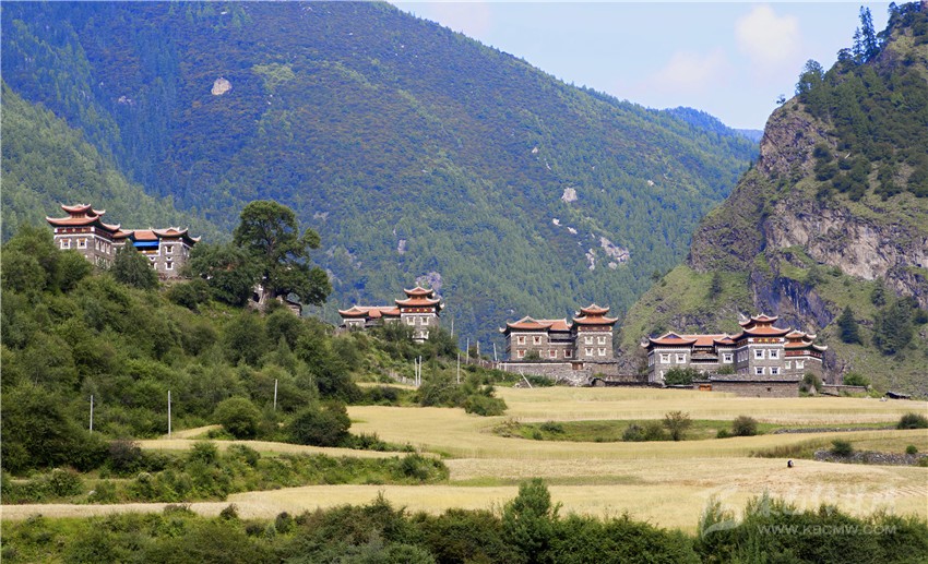 藏寨從大金河谷層層疊疊向上攀緣,在相對高差近千米的山坡上,一幢幢藏式樓房或星羅棋布,或稠密集中,錯(cuò)落有致。不時(shí)炊煙裊裊、云霧繚繞,詩情畫意。