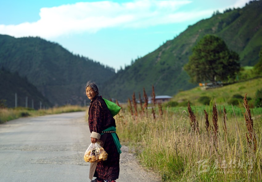 開(kāi)始收割了,從坡地到川地,到處是收割機(jī)的聲音。青稞是車(chē)巴溝的主要作物,因?yàn)橐デ囡妫贼佤?。村里人忙得團(tuán)團(tuán)轉(zhuǎn),收割機(jī)開(kāi)過(guò)去,大家就跟在后面撿穗子。如此往復(fù),一直要到糧食拉到家里。