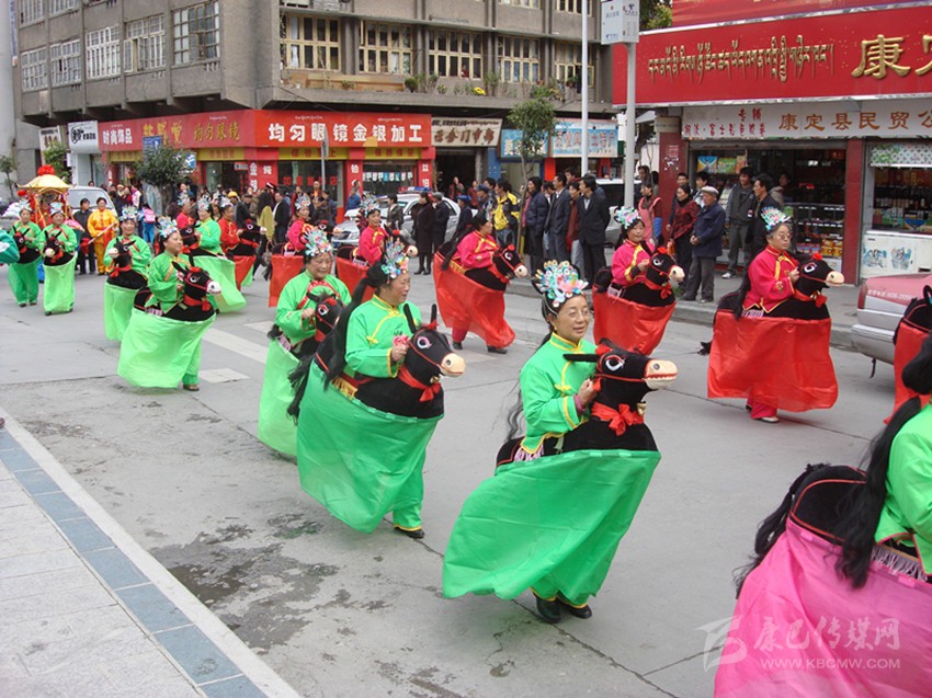半個世紀(jì)風(fēng)靡康定城的“船燈”、“馬馬燈”、“鬧山鼓”、“扭秧歌”、“笑頭和尚戲柳翠”、“霸王鞭”……整個兒就像老陜過年時的“社戲”場面。大年初一、十五夜“出燈”游街,熱鬧氣氛把整個年節(jié)塞得滿滿的。記得我孩童時見過一次“出燈”游行,不是晚上而是在大白天(叫“出游”)。寺廟喇嘛吹奏佛樂走在前面,接著是“川北”人的川劇鑼鼓;再后面跟著的就是“馬馬燈”、劉老陜的“船燈”、鐵木社的“龍燈”、二輕局的“霸王鞭”、南門上的弦子隊、三居委的腰鼓隊、北三巷的“道孚鍋莊隊”……游行隊伍遇街口寬敞地方必圍圈演出?!叭死侠?,人老啦,人老先從頭上老,白的多來黑的少, 開——船——羅!”“銀須飄灑”的艄公劉老陜用俏皮逗趣的陜腔告白開場詞,在歡喜鑼鼓的伴奏中“劃”著旱船出了場。旱船闖“急流”、過“險灘”,風(fēng)趣又逼真;如果哪家的姑娘打扮成古裝戲里的嬌美仕女坐上旱船游了街,那她立馬就成了康定城人皆贊譽(yù)的“美女”。接著就是“馬馬燈”,幾十個“騎馬橫槍”的古裝將士馳騁上場,排兵布陣,穿梭并行,“馬”鈴聲鼓樂聲交織一起……鬧翻了康定城的“三山二水”。