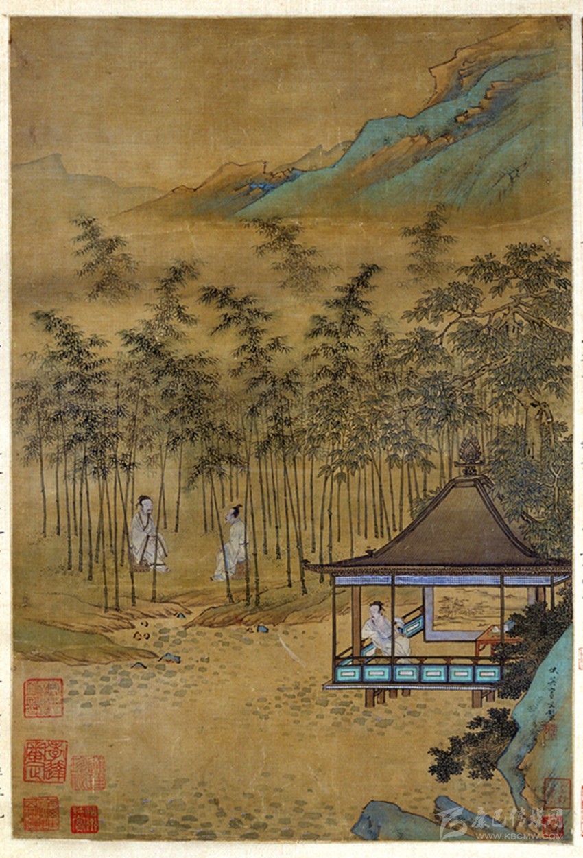 此圖意境極像唐代詩人王維的藍田山別墅。這里林木茂密,山澗淙淙,館舍、房屋散布其間,每到夏季,山風習習,涼爽怡人,王維和文友們在此度夏避暑,垂釣飲酒,談?wù)撛娢?,修身養(yǎng)性,過著悠閑自在的隱居生活。他在《竹里館》一詩里寫過自己的隱居快樂感受:“獨坐幽篁里,彈琴復長嘯。深林人不知,明月來相照?!比姼裾{(diào)幽靜閑遠,仿佛詩人的心境與自然的景致全部融為一體了。宋朝詩人楊萬里喜歡在皎潔的月光之下,清輝孤影,來到搖曳的竹林中,聽著夏夜里悅耳的蟲鳴,夜深氣清,盡管沒有涼風送爽,但是悶熱暑氣頓時消失,于是他寫了一首《夏夜追涼》詩:“夜熱依然午熱同,開門小立月明中。竹深樹密蟲鳴處,時有微涼不是風。”