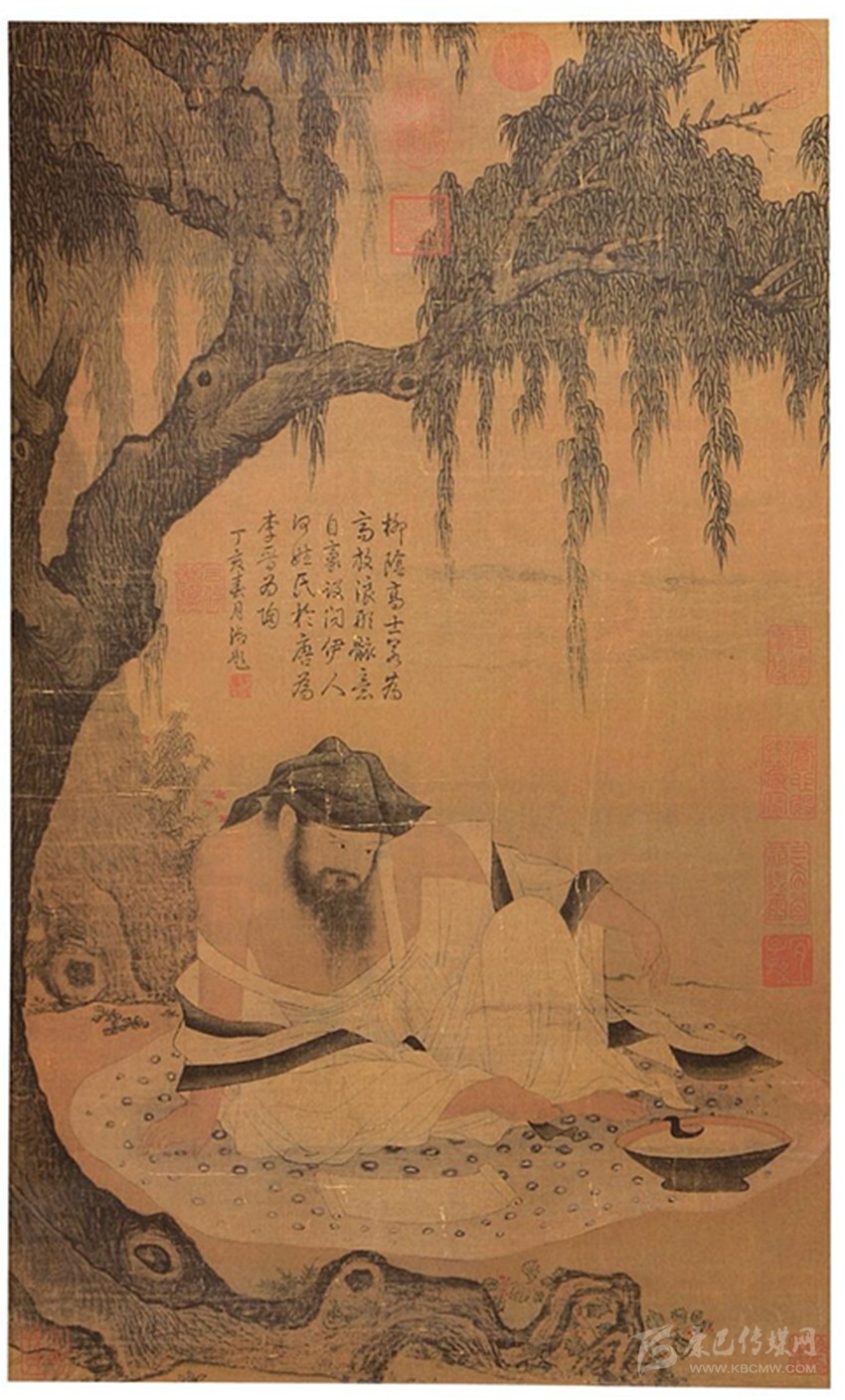 陶淵明曾說:“夏月虛閑,高臥北窗之下,清風颯至,自謂羲皇上人?!币粋€高人隱士酒后高臥草廬窗下,悠閑自得乘涼的形象躍然紙上。唐代詩人李白非常向往陶淵明恬淡閑逸、與世無爭、天人合一的隱逸生活,寫詩曰:“陶令日日醉,不知五柳春。素琴本無弦,漉酒用葛巾。清風北窗下,自謂羲皇人。何時到栗里,一見平生親?!北磉_了對陶淵明人品和理想的仰慕之情?,F(xiàn)藏于臺北故宮博物院的宋人《柳蔭高士圖》即是此意境。據(jù)《石渠寶笈》記載,此圖為素絹本著色畫,左方下有孫承澤印,右方下有北平孫氏印,左邊幅有棠村審定、蕉林二印。只知為宋人之作,相關(guān)的背景則無從查考。畫中為一棵古柳樹,樹干虬曲剛勁,枝葉繁茂。樹下一翁,美髯飄忽,袒胸露腹,頭戴葛巾,赤足席地而坐。坐前有一幅展開的手卷,酒樽滿盈,淺斟低酌。表面上看此翁雙目聚神,凝視手卷,實則已是眼餳耳熱,醺醺然不勝桮杓。清乾隆皇帝對《柳蔭高士圖》十分喜愛欣賞,在畫上御筆題詩云:“柳蔭高士若為高,放浪形骸意自豪。設(shè)問伊人何姓氏,于唐為李晉為陶?!鼻〉壅f,這位高士如是唐人就是李白,如是晉人便是陶淵明。但是從服飾和環(huán)境看,應是五柳先生陶潛也。這幅圖所表現(xiàn)的就是“心靜自然涼”。