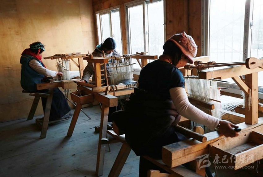 2003年,“編織班”邀請澤巴姆為老師,將這項技藝傳承了下來?,F(xiàn)在,澤巴姆年紀(jì)大了,牛羊毛絨編織這樣繁復(fù)又耗體力的事情她不再做了,全交給了自己的媳婦扎西巴姆——當(dāng)?shù)匚ㄒ坏呐Q蚪q編織老師。第二天,我們在編織班的工坊里見到了扎西巴姆。工坊一角的木架上擺著為數(shù)不多的圍巾、墊毯等產(chǎn)品,窗邊平行擺著六臺織機(jī),扎西巴姆正帶著幾個藏族婦女坐在其間飛梭走線。陽光從窗戶透進(jìn)來,投射在織機(jī)和織女們身上,古老的場景、緩慢的節(jié)奏恍惚把我?guī)Щ亓俗婺傅臅r代。扎西巴姆說,當(dāng)?shù)厝朔Q牦牛絨為