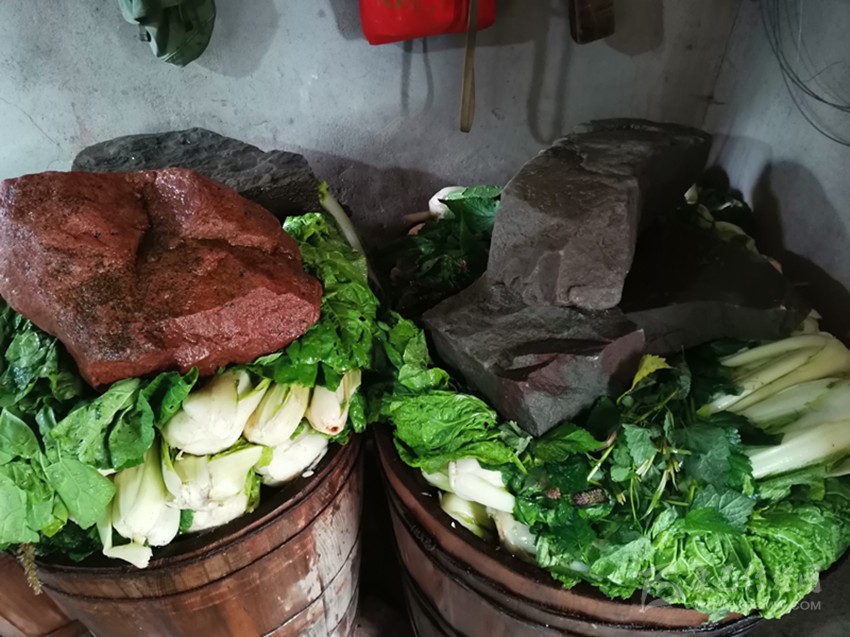 舊時(shí)化林坪家家都做鹽菜炒臘肉,為何李汝珍卻能在周家客棧的灶上烹調(diào)出這獨(dú)一份美味呢,原因就在這鹽白菜上面。據(jù)周家后人講述,李汝珍當(dāng)年對(duì)鹽白菜的制作頗為在行,從選材、抹料到腌制、晾曬,每個(gè)步驟每一種材料都非常講究。她用作腌菜的食材需葉片長(zhǎng)肉質(zhì)厚的半包心本地大白菜,花椒粉則選用麻香味醇的漢源花椒,所需之水必須為本地山泉,她還特意在腌制時(shí)加入茴香苗、藿香葉等香料,在木桶或水缸上以巖石加壓更是匠心獨(dú)具。精心制作的鹽白菜,常常晾曬于客棧屋檐下或墻外各處,以其醇香之味吸引客人前來。久而久之,周家客棧鹽白菜的美味之名被背夫們帶到各地,“鹽白菜炒臘肉”也成了茶馬古道上的一道名菜。
