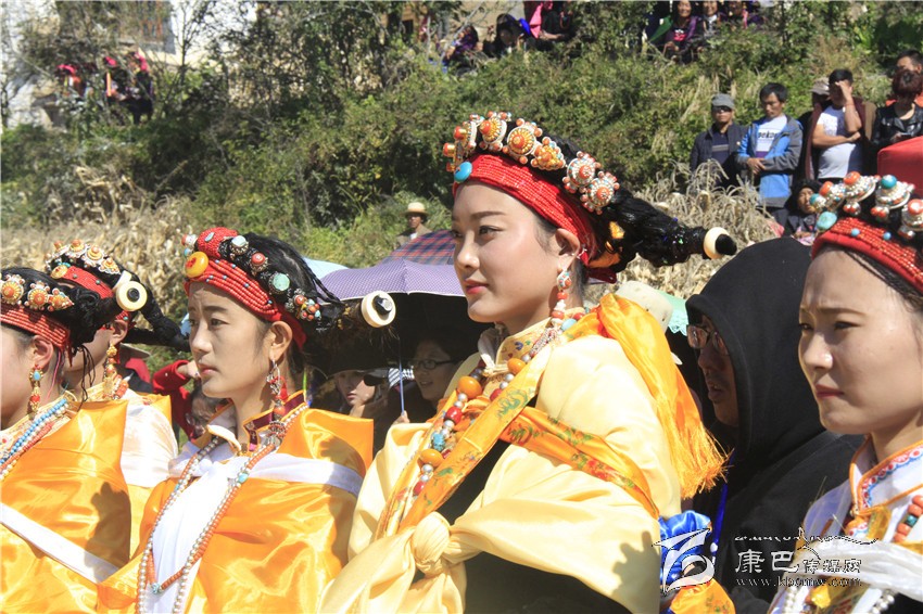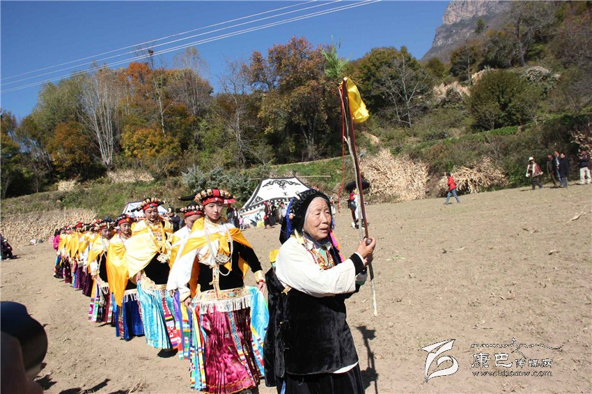 所有的祈福儀式結(jié)束后,村子里一位德高望重的長(zhǎng)輩走上圓臺(tái),用雄渾有力的嗓音向場(chǎng)地外等候的人們發(fā)出指令。在一段念詞結(jié)束之后,參加成人儀式女孩們的父親們?cè)谝晃焕先说闹敢戮従彽南驁?chǎng)地中央走來(lái),老人手舉一幅一米高的唐卡畫,口中念念有詞,走在他后面的父親們一襲白色的毪衫,頭戴一頂灰色的禮帽,腳穿紅黑相間的藏靴,頸上掛著一根潔白的哈達(dá),滿臉肅然的緊隨老人之后,來(lái)到月形的臺(tái)子邊,站成一個(gè)半圓形。當(dāng)父親隊(duì)站定后,母親隊(duì)們也向場(chǎng)地中移步而來(lái),本次成人儀式的主角們?cè)谝晃焕习尩膸ьI(lǐng)下向場(chǎng)地中走來(lái),每一位女孩穿著打扮都是那么的光鮮靚麗,每一個(gè)人都顯得美麗動(dòng)人,她們披著黃色的披風(fēng),一根白色的哈達(dá)在胸前打著結(jié),五顏六色的哈達(dá)懸掛在這根哈達(dá)上,在姑娘們的后背迎風(fēng)飄飛。走到圓臺(tái)邊,小女孩們也圍成半圓,低著頭,等待著喇嘛們的念經(jīng)祈福和家人的祈福。此時(shí),兩位吉祥老人站了起來(lái),手中拿著凈瓶,走到姑娘們面前,一邊念誦經(jīng)文,一邊將手中凈瓶里的水倒在姑娘們的手心里,姑娘們則虔誠(chéng)的將這圣水輕輕的抹在自己的額頭上,寓意吉祥如意。待喇嘛主持儀式結(jié)束后,主持儀式的老人用嘉絨語(yǔ)向蒼天和墨爾多神山祈禱,希望神賜予孩子們美麗的面容和美好的心靈,從今日起,她們就可以真正的長(zhǎng)大成人了。吉祥詞念誦完后,母親們排著長(zhǎng)長(zhǎng)的隊(duì)伍緩緩來(lái)到孩子們的面前,將懸掛在胸前的哈達(dá)取下,久久的凝視著女兒的臉,眼角掛著幸福的淚水,用顫抖的聲音為女兒祈福,叮囑孩子們要孝敬父母,做一個(gè)正直善良的人,然后,才將白色的哈達(dá)掛在女兒的頸上,父親們則站在原地,看著母親們將哈達(dá)和祝福送給女兒,見證著女兒們的長(zhǎng)大成人。接受完父母和長(zhǎng)輩們的祝福之后,盛大的鍋莊舞會(huì)開始了。小女孩們也跟隨著這些舞者們手牽著手走到場(chǎng)地中央,跳起歡快的鍋莊舞。擁忠大娘說(shuō),成年禮上的鍋莊舞會(huì)一般都要視參加成人禮儀式女孩們親戚多寡而定,每一名長(zhǎng)輩都會(huì)走到場(chǎng)地中牽頭,跳起舞蹈,這時(shí)候是女孩的長(zhǎng)輩們炫耀舞技和歌聲的時(shí)候,他們矯健的舞步和甜美的歌喉迎來(lái)眾人的和鳴。