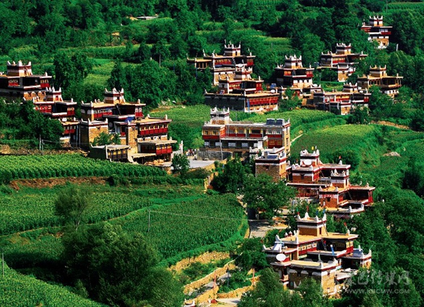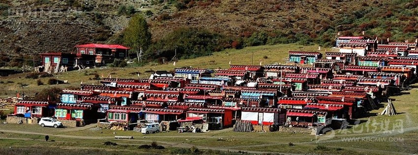 藏式房多平頂,可以說(shuō)是環(huán)境的產(chǎn)物。高原干旱少雨,無(wú)須飛檐高頂,冬有積雪,便于打掃;最重要的是風(fēng)沙大而頻繁,高屋難耐勁風(fēng)。此外,平頂民房還有一個(gè)精神功能就是作為信仰的場(chǎng)所。房頂供奉有神靈的祭壇,有煨桑的香爐,更有家家必插的五色經(jīng)幡,有的房頂平臺(tái)的圖符裝飾極為精美,把最古老的建筑樣式和最現(xiàn)代的建筑格調(diào)融為一體。另一個(gè)共同特點(diǎn)便是,一般講究一些的農(nóng)村都把房子的夯土外壁刷成暗含深意的純白。這自然是典型的藏式院落了。而不太講究的半農(nóng)半牧區(qū)則保持原色。白色房屋上部突出棕色材料的房檐,或漆成棕紅的裝飾帶,既勾勒出輪廓,又平添了幾多美觀。白色建筑在藏語(yǔ)中有個(gè)非常詩(shī)意的名字,叫“點(diǎn)點(diǎn)繁星”。