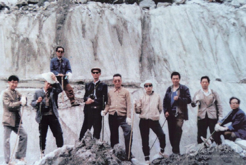 省政府海螺溝考察組在1號冰川,右起四:夏仲勛、五:劉祖仁,六:盧勛等。(1987年5月14日攝)