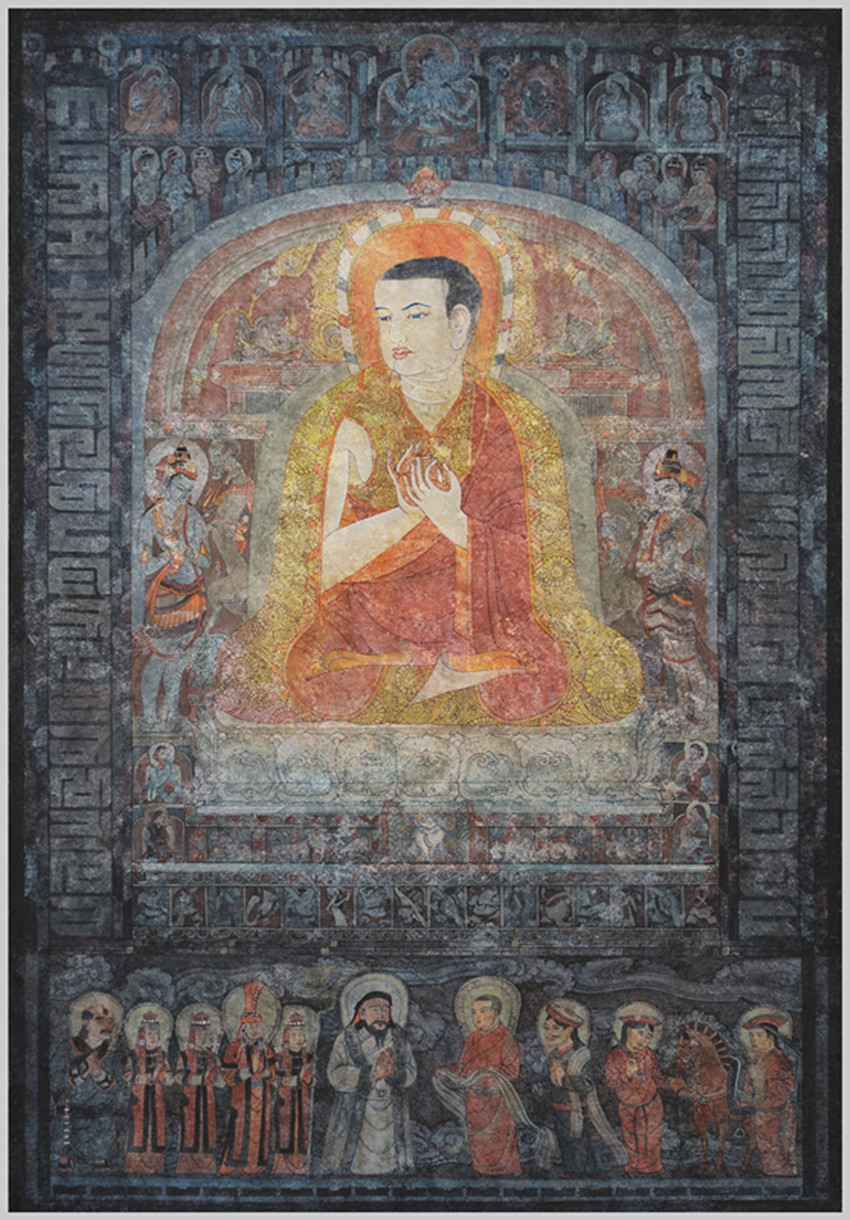 從“三怙主”往兩邊發(fā)展,分別是早期“薩迦五祖”中的前“四祖”:初祖貢噶寧布(1092--1158年);二祖索南孜摩(1142--1182年),三祖扎巴堅贊(1147--1216年),四祖貢噶堅贊(1180--1251年),即“薩迦班智達”。而薩迦第五祖就是畫面正中的八思巴(1235--1280年)。根據(jù)藏文史料,薩迦五祖中的前三祖稱為“白衣三祖”,因為他們都沒有正式出家受比丘戒,而是身著俗衣以居士身份自居;后二祖稱為“紅衣二祖”,因為他倆正式出家為僧,受過比丘戒,身著紅色袈裟。1253年夏天,忽必烈的軍隊到達六盤山一帶,請八思巴到軍營一敘,雖然有的史書記載之前八思巴就與忽必烈見過面,但這次是八思巴第一次以薩迦教主身份正式會見忽必烈。畫面的下方表現(xiàn)的就是“六盤山相會”的歷史場景。畫面右邊是八思巴一行列隊迎接的場面。中間著紅色吐蕃服裝者即是八思巴,他手捧哈達、神情莊嚴(yán)的給忽必烈獻上哈達,紅色吐蕃衣服暗示他當(dāng)時還未受比丘戒的“紅衣”身份;在他身后哈達搭肩、雙手合十者為其弟恰那多吉,藏青色衣服暗示他的俗人身份;隊列后面是兩位服侍教主的僧侶,他們頭戴吐蕃氈帽、牽馬負笈等候在一旁。左邊是蒙古王族的儀仗隊列,為首便是身著白色裘衣的忽必烈。其后是三個侍女簇擁著的察必王妃,第一位侍女扶著代表皇族的華蓋,而淡青色華蓋說明:忽必烈當(dāng)時尚未繼承蒙古大汗位。察必王妃和侍女皆穿著紅色的蒙古弘吉剌部落服裝,所不同的是王妃服飾比侍女服飾更顯尊貴和優(yōu)雅;隊伍的最后是一位穿著青衣、佩戴短刀的蒙古侍衛(wèi)。整個蒙古王族隊列面對將來的帝師八思巴,大家都謙遜、虔誠、靜穆地雙手合十致意。忽必烈、察必王妃以及八思巴的形象是根據(jù)古代繪畫作品和文字描述而創(chuàng)作的,服飾、用具、民風(fēng)民俗也都經(jīng)過仔細的研究考證。畫面兩邊是用“八思巴文”的字母組成的紀(jì)念柱,彰顯八思巴創(chuàng)立“蒙古新字”的功勛。受忽必烈指派,八思巴借鑒藏文拼讀方式創(chuàng)制出由41個字母構(gòu)成的一種新文字,其語音拼讀均按蒙語,又稱“八思巴蒙文”。八思巴向忽必烈呈獻蒙古新字后,忽必烈極為高興,并於1268年下詔,凡是詔書及各地方公文等均必須使用蒙古新字,在全國范圍內(nèi)推行這種新文字。
