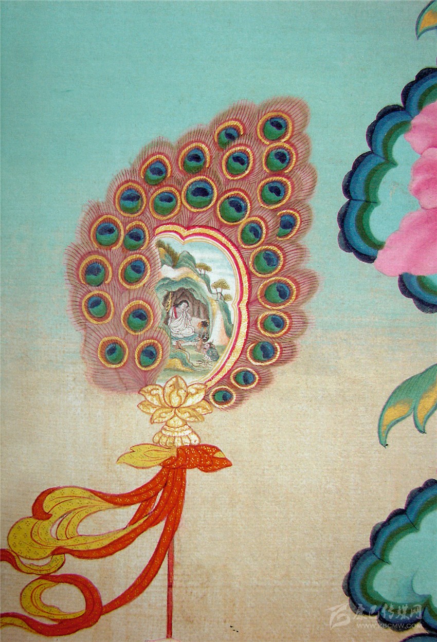 當(dāng)然,我們可以從存世的作品上印證他的這種能力。比如是在《如意寶藤之釋迦牟尼》中:左側(cè)侍女手持一把孔雀羽扇,在羽扇的中央是一塊約四平方厘米的畫(huà)屏;在這個(gè)小小的空間里面,郎卡杰描繪了一幅微縮的《修行圖》,圖中米拉日巴正在洞中苦修,洞口蹲伏著獵犬、鹿和獵人。畫(huà)中動(dòng)物與人結(jié)構(gòu)準(zhǔn)確,五官準(zhǔn)確,須發(fā)清晰,衣紋細(xì)密流暢;山洞上的樹(shù)木能區(qū)分出樹(shù)干和樹(shù)葉;天空的白云有遠(yuǎn)近層次。在這不足盈寸的空間里,用毛筆刻畫(huà)這般細(xì)致,令人嘆為觀止。
