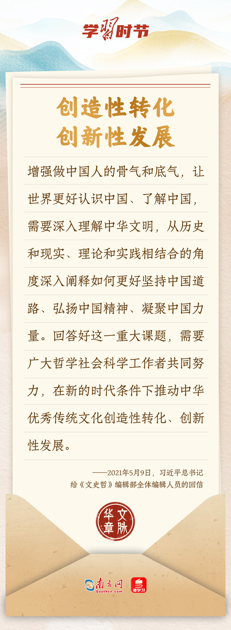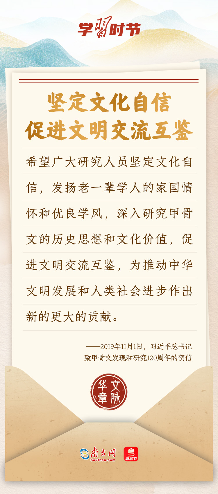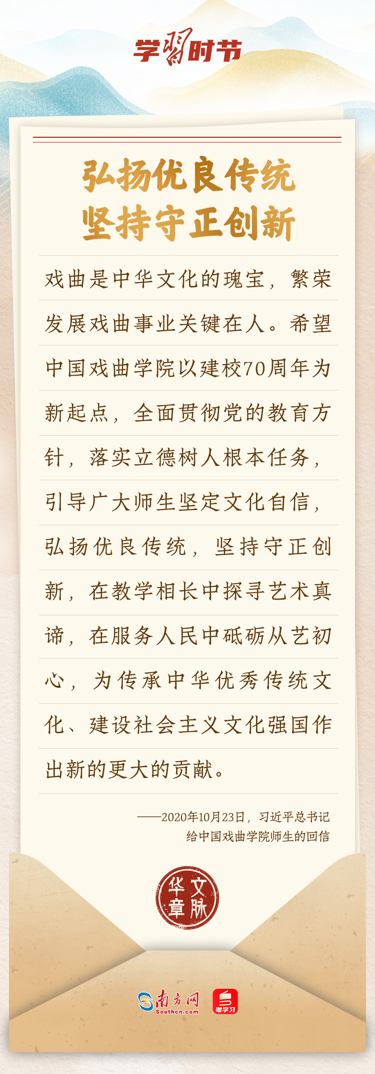 “中華民族在幾千年歷史中創(chuàng)造和延續(xù)的中華優(yōu)秀傳統(tǒng)文化,是中華民族的根和魂。”習(xí)近平總書記多次通過發(fā)賀信、寫回信等方式,表達(dá)著對弘揚中華優(yōu)秀傳統(tǒng)文化的殷切希望,飽含深情、字字暖心、催人奮進(jìn)。讓我們一起“讀”信。