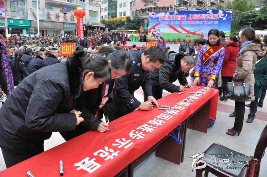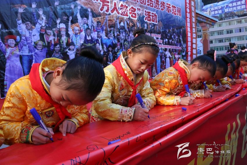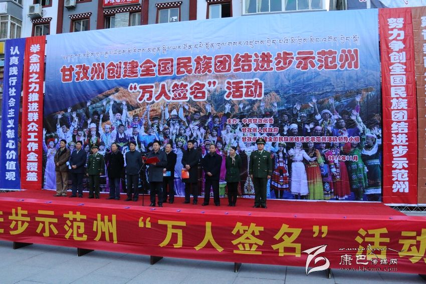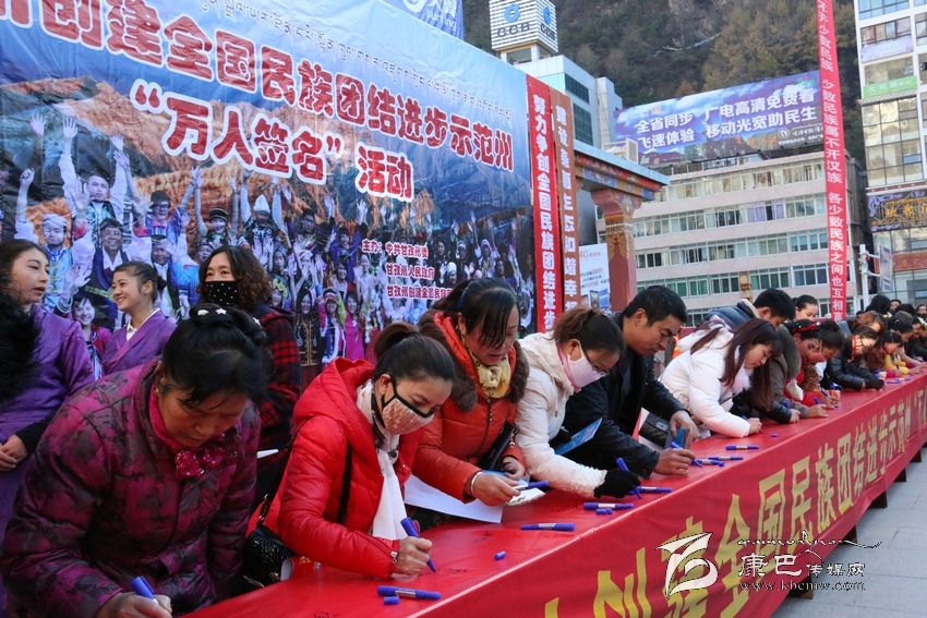 州人大常委會副主任李致民宣布創(chuàng)建全國民族團結(jié)進步示范州“萬人簽名”活動正式開始后,州領導汪洋、李致民、楊國元、范文華、蔣秀英、楊學康以及甘孜軍分區(qū)、駐州武警部隊領導同州級機關、志愿者、個體工商戶、學生、駐軍、政法干警、康定縣黨政機關干部代表近千人,陸續(xù)到“萬人簽名”條幅上簽下了自己的姓名。