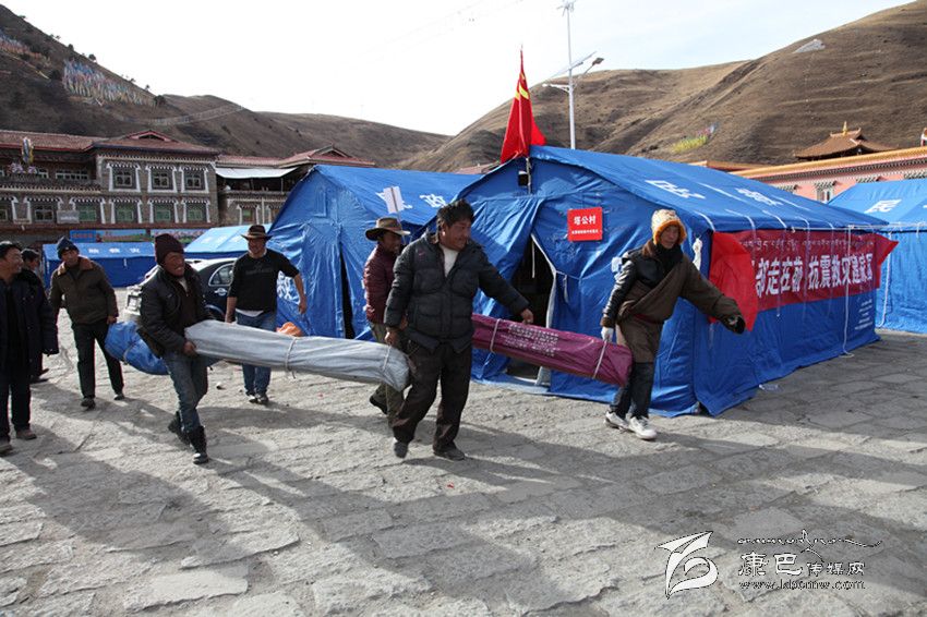 塔公鄉(xiāng)塔公村黨員服務(wù)隊(duì)在支書張東升的帶領(lǐng)下為災(zāi)民搭建帳篷。