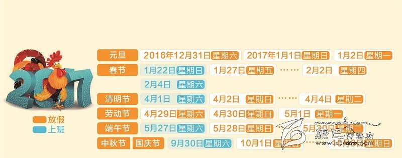 經(jīng)國務院批準,現(xiàn)將2017年元旦、春節(jié)、清明節(jié)、勞動節(jié)、端午節(jié)、中秋節(jié)和國慶節(jié)放假調(diào)休日期的具體安排通知如下。