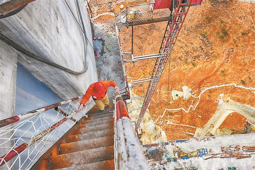 工人們在橋塔頂部調(diào)運設(shè)備。
