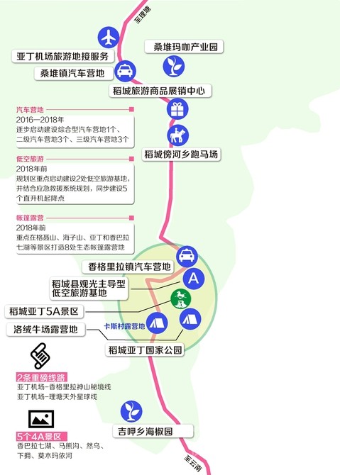 根據(jù)《規(guī)劃》,將結(jié)合道路交通和旅游景區(qū)景點(diǎn)分布,2016—2018年,逐步啟動(dòng)建設(shè)綜合型汽車(chē)營(yíng)地1個(gè)、二級(jí)汽車(chē)營(yíng)地3個(gè)、三級(jí)汽車(chē)營(yíng)地3個(gè),作為建設(shè)環(huán)亞丁兩小時(shí)旅游圈的重要旅游項(xiàng)目,滿(mǎn)足日益增長(zhǎng)的自駕車(chē)游客需求。