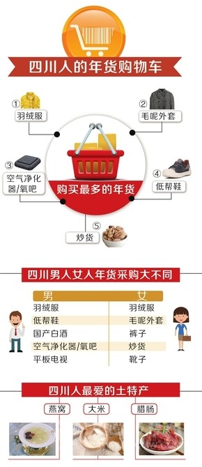 還有幾天就過年了,你們家買了哪些年貨?近日,電商平臺阿里巴巴和京東先后推出了年貨大數(shù)據(jù)。從這些數(shù)據(jù)中,我們能看到一個(gè)典型成都人的年貨網(wǎng)絡(luò)購物車是這樣的:購買最多的年貨還是衣服,其中羽絨服、毛呢外套是成都人的最愛;家電和電子產(chǎn)品愛買空氣凈化設(shè)備和玫瑰金iPhone7手機(jī);食品是山核桃等炒貨,以及國產(chǎn)白酒。在女性偏好酒水消費(fèi)的排名中,四川女性排名第五。