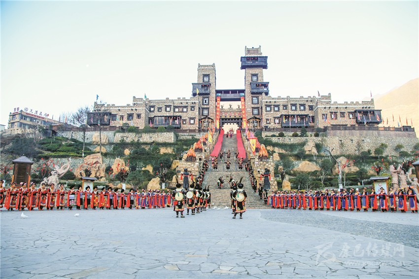 圖為中國(guó)古羌城原汁原味的羌城開城門儀式。