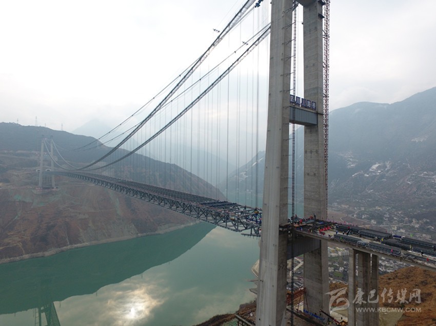 “大橋鋼桁梁完成合龍,標(biāo)志著大橋全面進(jìn)入橋面施工階段,也標(biāo)志著這座建設(shè)在高海拔、高地震烈度帶、復(fù)雜風(fēng)場環(huán)境下的超大跨徑鋼桁梁懸索橋,施工中最難、風(fēng)險最大的施工全面完工?!毖趴蹈咚夙椖坎扛苯?jīng)理柏國勝激動地說。