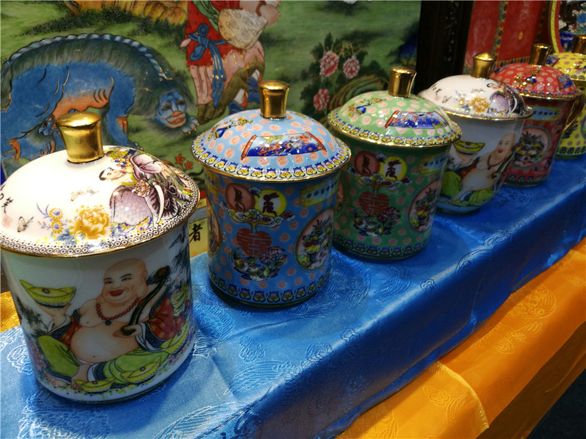 5月11日是開館第二天,付國華和馮建華就在燈光下對傳統(tǒng)陶瓷和高溫粉彩進行比對。說起創(chuàng)作,57歲的付國華在認識馮建華之前,對唐卡藝術有很深的感情,他非常喜愛這一文化,想方設法去創(chuàng)新。他說,唐卡藝術和陶瓷藝術,都是最民族,最世界的中華文化藝術瑰寶。將兩大藝術結(jié)合創(chuàng)造更精美的陶瓷唐卡,是很多人的夢想,一代又一代的藝術家為此付出了不懈的努力。唐卡,最顯著的特點是色彩靚麗豐富,線條精細入微,是典型的工筆重彩。要在瓷板上畫唐卡,人們普遍使用的是“粉彩”工藝。粉彩工藝解決了唐卡的色彩和線條問題,但因其是中溫燒制(900度以下),畫面附著在釉面上,所以怕磨損,易掉色,返鉛,晦暗,且含有害重金屬等缺陷十分明顯。在現(xiàn)有琺瑯彩、釉下五彩、斗彩等等陶瓷唐卡中,不能全面解決怕磨、掉色、返鉛、晦暗線條細膩等問題,難以滿足唐卡對色彩的色值,色域,線條的“精密度 ”要求,此類陶瓷唐卡“先天不足”就顯現(xiàn)出來了:比起原作唐卡,色彩范圍單調(diào),過渡生硬,無法精準定位色值和線條,畫面顯得僵硬呆板,只能表現(xiàn)畫面比較簡單,色彩比較單一的唐卡。明顯失去了唐卡“熱烈奔放”“精細如發(fā)”的特點。看著他們苦心研制出高溫粉彩唐卡,在此次文博會上受到眾多觀展者的好評,付國華覺得這五年來付出的心血都是值得的。