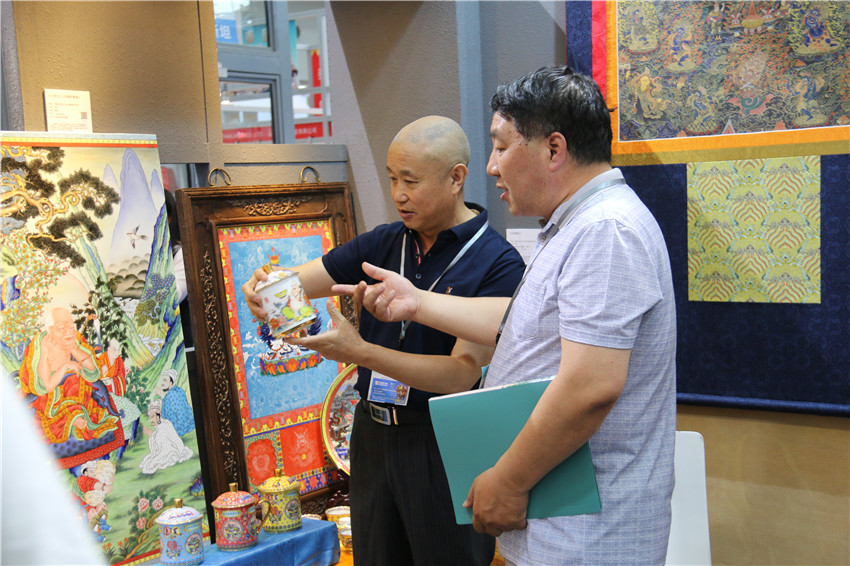本網(wǎng)訊(記者 宋志勇 文/圖)“我是一次摔壞陶瓷,成就了我和馮建華藝術合作?!边@是參加第十四屆中國(深圳)國際文化產(chǎn)業(yè)博覽交易會上,來自爐霍縣華彩文化傳播有限公司參展商付國華這樣說,而在馮建華心里,雖然這是他的鎮(zhèn)館之寶,但他對付國華這位千里迢迢從甘孜藏區(qū)來到景德鎮(zhèn),感到自豪和高興,于是結(jié)下了深厚的感情,因此完成了唐卡與陶瓷藝術的完美結(jié)合——高溫粉彩瓷板。