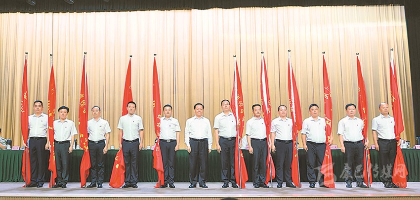 6月20日,省綜合幫扶涼山州打贏脫貧攻堅戰(zhàn)動員大會在西昌召開。省委書記彭清華向11個脫貧攻堅綜合幫扶工作隊授旗。 四川日報記者 歐陽杰 攝