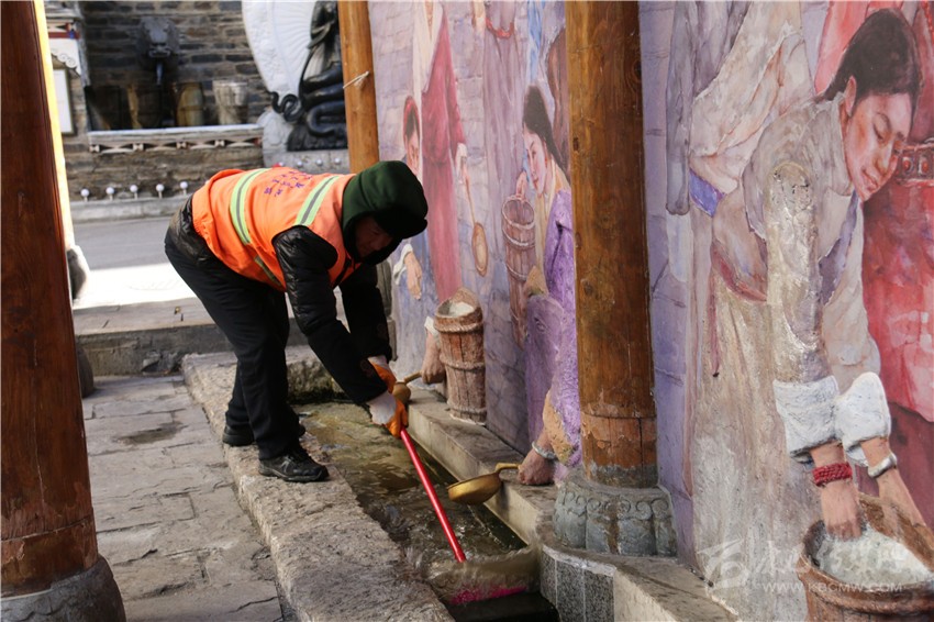 每逢節(jié)假日,是環(huán)衛(wèi)工人最忙最累的時候。2月5日下午,康定強(qiáng)盛公司清洗組組長楊曉康帶著全組工作人員來到康定市水井子,打掃整個水井子的環(huán)境衛(wèi)生?!俺跻弧畵岊^水’是多年來康定市民的過年習(xí)俗,我們現(xiàn)在把這里打掃干凈,讓市民們在‘搶頭水’時有干凈整潔的環(huán)境?!睏顣钥蹈嬖V記者。