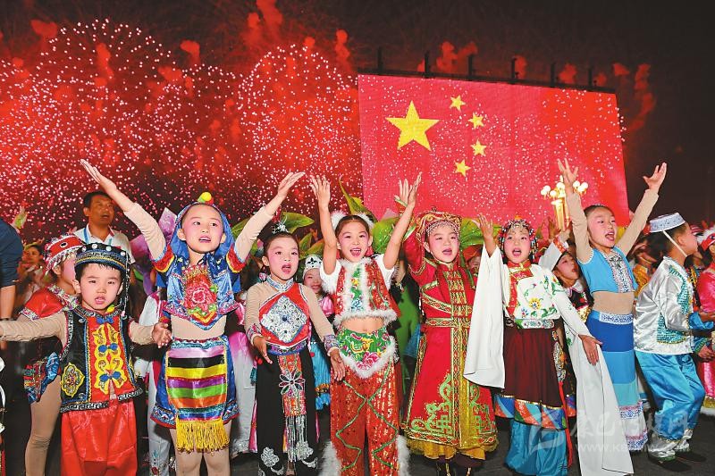 在世界最大的廣場(chǎng),上演著一場(chǎng)特殊的“快閃”:少年兒童從金水橋走來(lái),稚嫩的童聲響亮。國(guó)旗旗桿旁的戰(zhàn)士在唱,身著盛裝的各民族代表在唱,和睦幸福的一家人在唱……全場(chǎng)聯(lián)歡群眾和現(xiàn)場(chǎng)觀眾形成氣勢(shì)恢弘的大合唱。