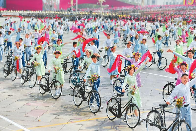 在10月1日上午進(jìn)行的國(guó)慶70周年群眾游行中,上百名少男少女騎著自行車從廣場(chǎng)通過。這個(gè)主題為“青春萬歲”的場(chǎng)景喚醒了很多人對(duì)20世紀(jì)80年代的時(shí)代記憶……這是本次群眾游行中的第一個(gè)情境式行進(jìn)。