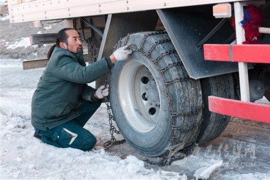其美多吉在途中幫助社會車輛安裝防滑鏈(資料照片)。其美多吉是中國郵政甘孜縣分公司郵運(yùn)駕駛組的一名郵車司機(jī),往返在甘孜縣與德格縣之間。這段路程是四川省甘孜州綿延5866公里、平均海拔超過3500米的雪線郵路最危險(xiǎn)的一段。新華社發(fā)(周兵 攝)