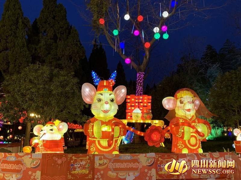 據(jù)成都武侯祠博物館工作人員介紹,“2020武侯祠成都大廟會”對燈組景觀和光影效果進(jìn)行了全面升級,正門燈組主架構(gòu)以漢闕風(fēng)格和傳統(tǒng)吉祥圖案為基本元素,中為成都傳統(tǒng)民俗IP喜神主題的諸葛亮形象,兩側(cè)為兩只活潑可愛的生肖鼠,為游客送上“吉祥如意”和“鼠年大吉”的祝福。西區(qū)廣場和軸線兩大燈組分別以“喜神送寶”和“魅力天府”為主題,將生肖鼠和紅包、祥云、銀杏等吉祥元素相結(jié)合,營造溫馨、浪漫和喜慶的節(jié)日氛圍,呈現(xiàn)出吉慶祥和、物豐民富、前程似錦的魅力天府景象。西區(qū)湖面“三顧草廬”大型燈組長寬均達(dá)50米,高度超過20米,為歷屆廟會之最,形象上以大型彩燈描繪歷史故事,展示武侯祠作為“三國圣地”的厚重歷史底蘊(yùn),配合蓮花、仙鶴、祥云、福樹等點(diǎn)綴和流水追光,將宏大敘事和細(xì)節(jié)裝飾完美融合。