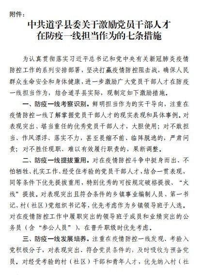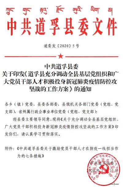 疾風知勁草,板蕩識誠臣。自新型冠狀病毒肺炎疫情防控阻擊戰(zhàn)打響以來,道孚縣各級黨組織和黨員、干部主動擔當作為,積極投入疫情防控最前線,為有力防控疫情蔓延作出重要貢獻。近日,道孚縣委印發(fā)《中共道孚縣委關(guān)于激勵黨員干部人才在防疫一線擔當作為的七條措施》,關(guān)心關(guān)愛、激勵引導(dǎo)廣大黨員、干部、各類人才在疫情防控一線履職盡責、擔當作為、安心戰(zhàn)斗。