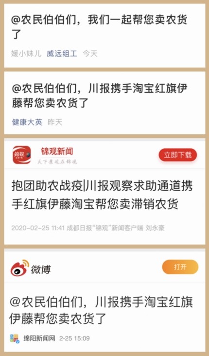 多地市州媒體及縣級融媒體中心的關注積極響應參與活動。“網(wǎng)信四川”公眾號、南充日報“南充見”、成都日報錦觀、眉山在線、開江發(fā)布、直播鹽亭、綿陽新聞網(wǎng)、宜賓日報、威遠組工、健康大英等均及時對活動相關信息進行了發(fā)布,及時把抱團助農(nóng)戰(zhàn)疫活動信息帶給當?shù)赜行枨蟮霓r(nóng)戶。