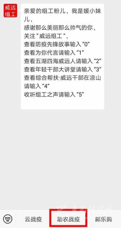 除了媒體之外,一些機關單位的政務新媒體也為活動“站臺”,“威遠組工”官方微信公眾號的底部菜單欄,特別新增了“助農(nóng)戰(zhàn)疫”專欄,直接連通川報觀察頁面,為當?shù)剞r(nóng)戶及農(nóng)業(yè)經(jīng)營戶提供解決難題的路徑。