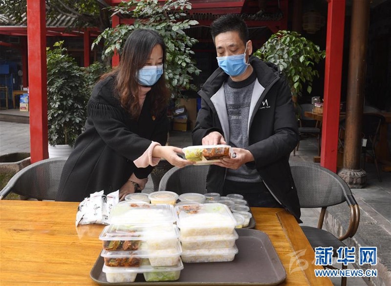 “女子服務(wù)隊”工作人員沈娜(左)向成都市金牛區(qū)“寇家大院”餐廳執(zhí)行店長陳心華了解盒飯配送情況(2月28日攝)。新華社記者 劉坤 攝
