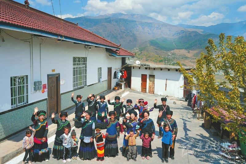 越西縣鐵西鄉(xiāng)阿支吾村,村民們?cè)谪毨赳R海大爾(右一)新居前合影。