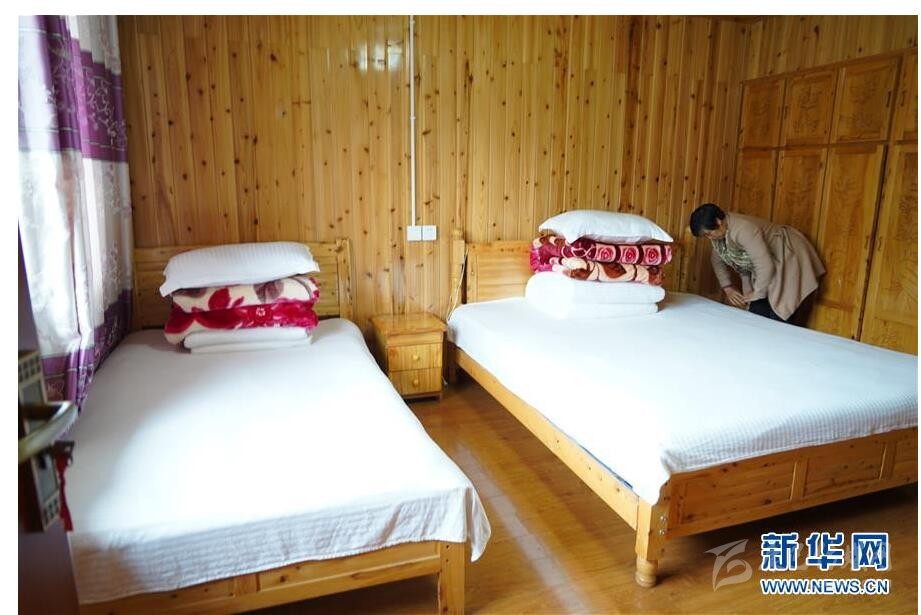 4月19日,在蘆山縣龍門鎮(zhèn)白伙新村,村民在自家民宿整理房間。