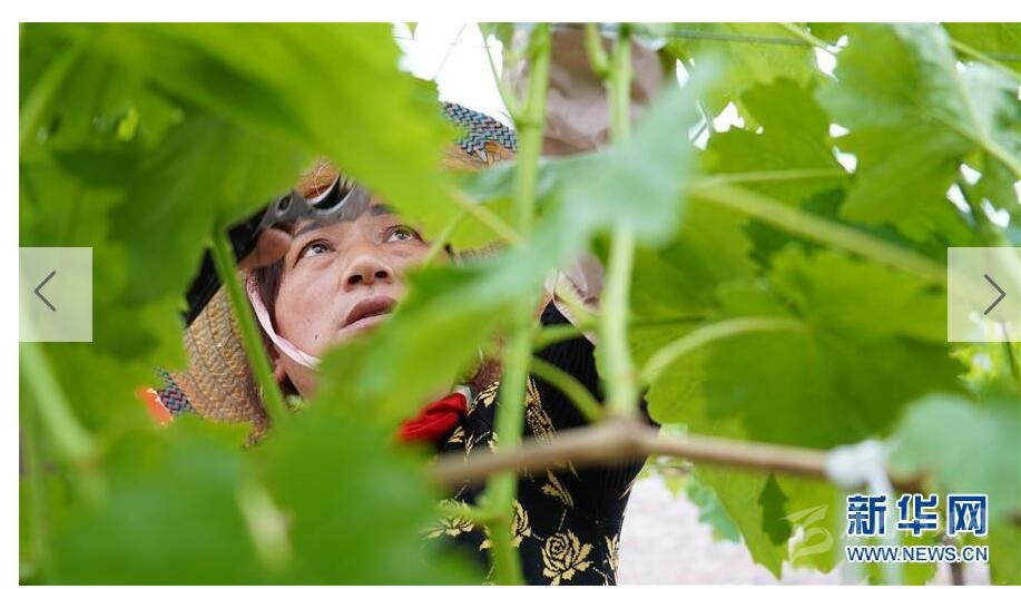 4月20日,在蘆山縣紅星村好農(nóng)夫家庭農(nóng)場,工人在固定葡萄藤蔓。這家農(nóng)場采取“種養(yǎng)循環(huán)”模式,用雞鴨糞給農(nóng)作物提供肥料。
