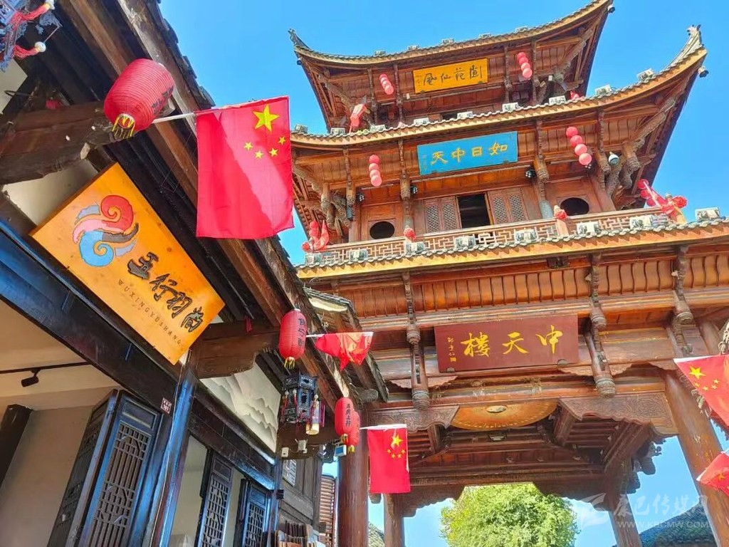 在南充古城閬中,以中天樓為核心鋪開的四條街道,全部被五星紅旗裝點(diǎn)開來,甚至部分街段上空鋪上了“紅旗?!薄P鲁堑闹鞲傻?,也掛上了一面面五星紅旗,站在街頭放眼望去,鮮艷的五星紅旗成為一道最靚麗的風(fēng)景線。