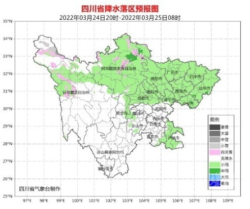 明天(3月25日)白天,盆地各市陰天轉(zhuǎn)多云,西部沿山有分散小雨;阿壩州大部、甘孜州北部東部陰天間多云有小雨(雪),甘孜州其余地方和攀西地區(qū)多云間晴。