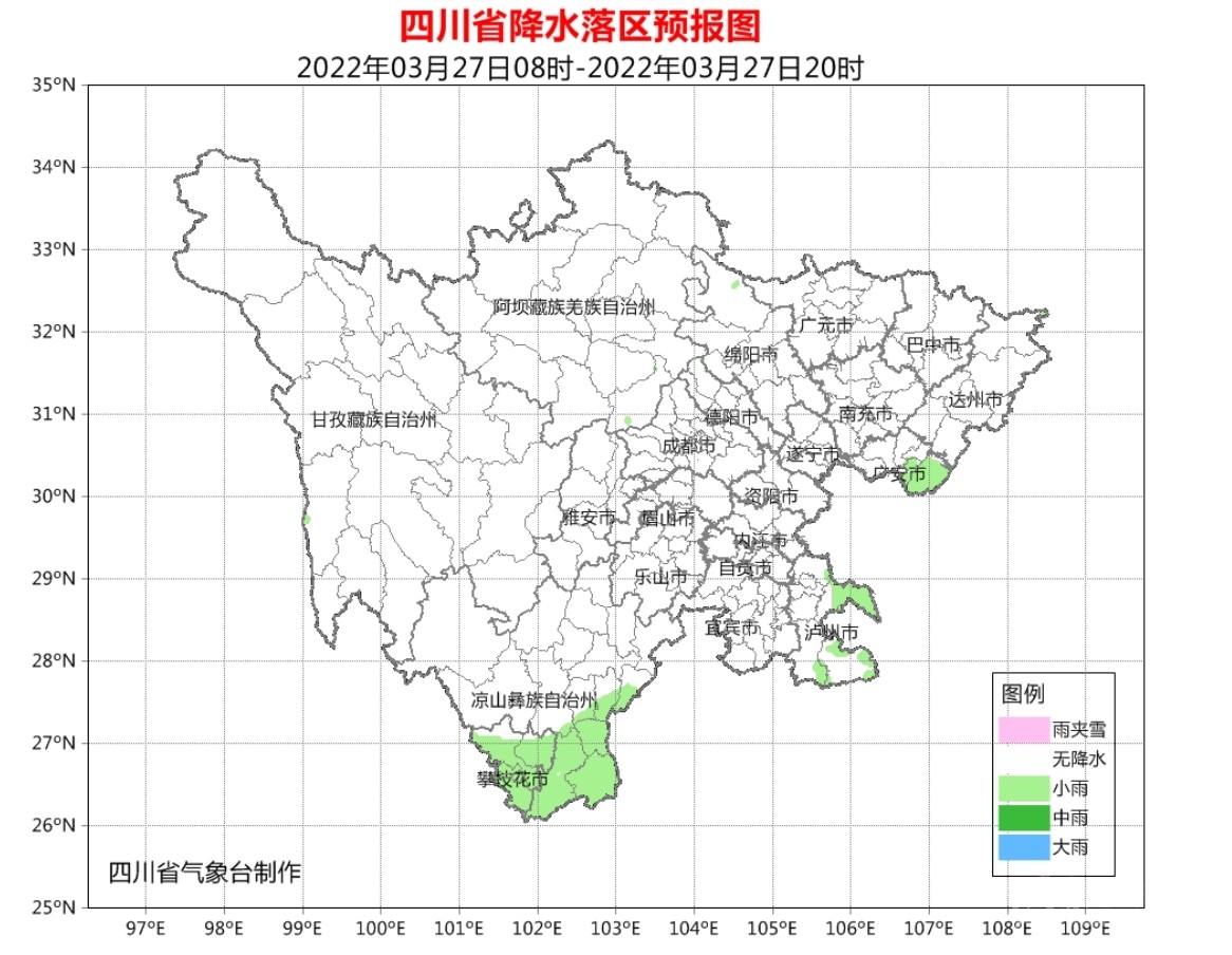 今天晚上:廣元、巴中、綿陽、德陽4市和成都、達(dá)州、南充3市北部陰天,盆地其余地方小雨,廣安、瀘州2市局部有中雨;阿壩州大部和甘孜州南部有陣雪(雨),甘孜州北部陰天;攀西地區(qū)陰天有小雨,局部地方有中雨。