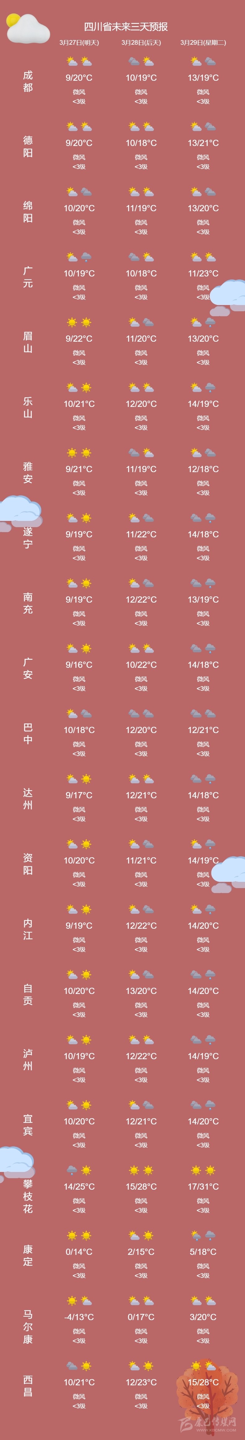 預(yù)計(jì)28~29日盆地大部多云,局部陣雨,川西高原和攀西地區(qū)晴間多云;30日~4月2日我省有一次降溫、降水天氣過程,其中盆地大部和攀西地區(qū)及川西高原東部南部有小到中雨,局部大雨。