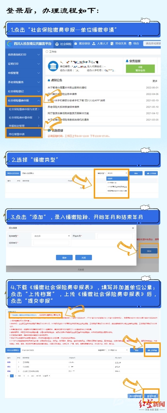 7月26日,紅星新聞?dòng)浾邚某啥际腥松缇肢@悉,今年6月,四川省人社廳、省發(fā)改委、省財(cái)政廳、省稅務(wù)局聯(lián)合出臺(tái)的《關(guān)于擴(kuò)大階段性緩繳社會(huì)保險(xiǎn)費(fèi)政策實(shí)施范圍等問題的通知》,明確了延長(zhǎng)階段性減免企業(yè)基本養(yǎng)老保險(xiǎn)、失業(yè)保險(xiǎn)、工傷保險(xiǎn)單位繳費(fèi)政策實(shí)施期限,同時(shí)將階段性緩繳社會(huì)保險(xiǎn)費(fèi)政策擴(kuò)圍至22個(gè)行業(yè)。
