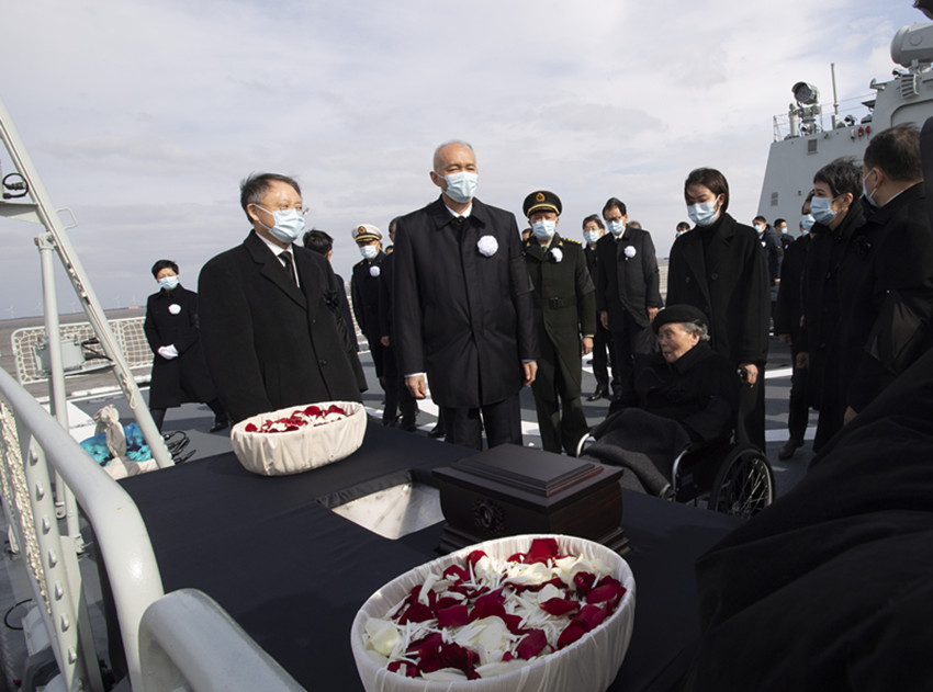 吳淞軍港碼頭,國旗半垂,莊嚴(yán)肅穆。黑底白字橫幅上寫著:“江澤民同志永垂不朽”“江澤民同志永遠(yuǎn)活在我們心中”。海軍官兵整齊列隊,脫帽致禮。江澤民同志的親屬捧護(hù)著骨灰走下靈車,將骨灰安放在靈桌上。低回的哀樂聲中,送別的人們神情凝重,列隊肅立,深深鞠躬,向江澤民同志作最后的告別。