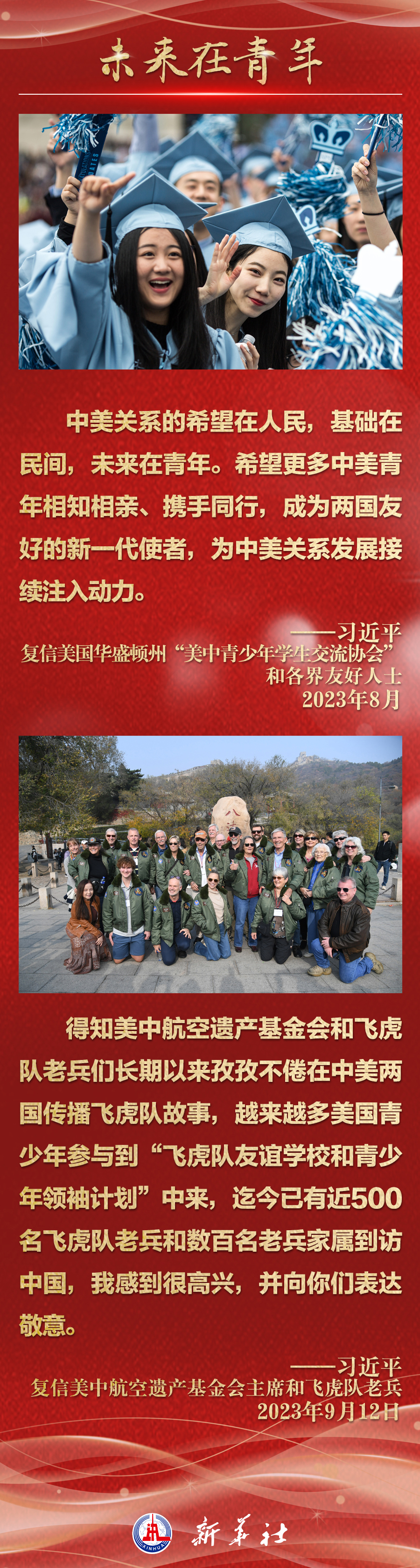 今年以來,從在京會(huì)見美國(guó)各界人士,到向“鼓嶺緣”中美民間友好論壇等活動(dòng)致賀信,再到復(fù)信美國(guó)華盛頓州“美中青少年學(xué)生交流協(xié)會(huì)”、史迪威將軍后人、飛虎隊(duì)老兵等友好人士,習(xí)近平主席同美國(guó)各界真摯互動(dòng),強(qiáng)調(diào)中美關(guān)系基礎(chǔ)在民間,希望在人民,未來在青年,活力在地方。